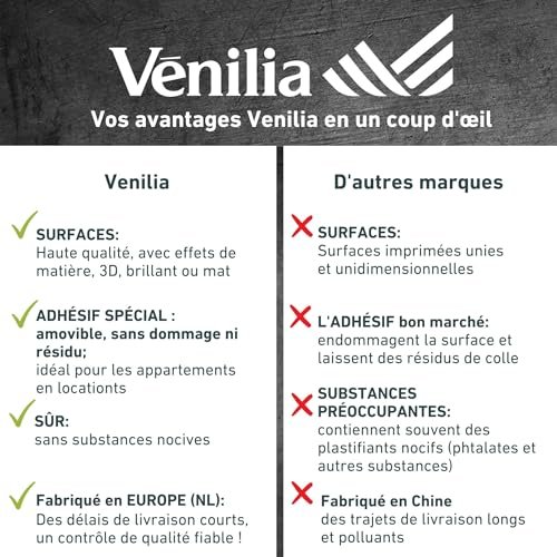 LARGE CHOIX DE DESIGNS : Venilia est votre expert en matière d’aménagement intérieur depuis 1874, Nous offrons un large choix de designs pour nos feuilles auto-adhésives, notamment du bois, du marbre, de la pierre, des fleurs et bien plus encore, Peu importe le style que vous préférez, nous avons certainement le design qui convient à vos besoins,