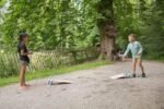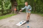 Jouez à ce jeu à deux ou avec un groupe d’amis ou une famille. Placez les planches l’une en face de l’autre. Préparez les équipes et lancez à tour de rôle. Marquez 1 point pour les sacs qui sont sur la planche, le triple pour les sacs qui vont dans le trou. La première équipe à atteindre 21 points remporte la partie.
