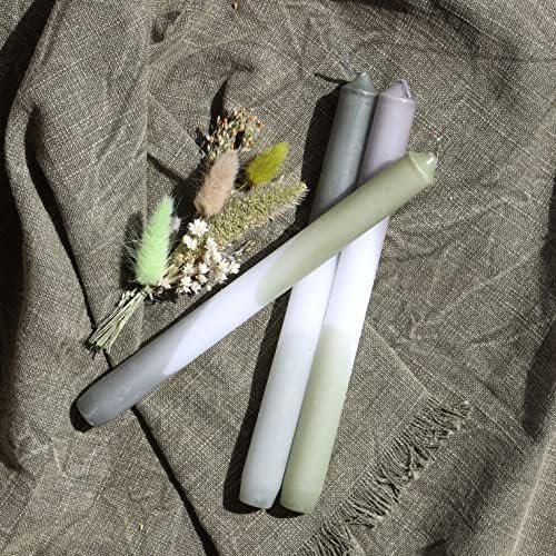 Lot de bougies tricolores Trempé à la main en vert clair, vert, vert mousse et taupe Environ Durée de combustion : 9 heures Cire de paraffine Sans odeur Faible suie et anti-gouttes Dimensions : Longueur : 24 cm – Diamètre : 2,2 cm