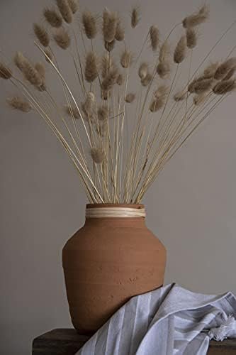 Ce vase fabriqué à la main en terre cuite naturelle est accentué par un enroulement complexe en rotin autour du bord qui est fait à la main. Ce vase passe facilement d’une saison à l’autre et est idéal pour les styles de décoration bohème ou rustique. La couleur neutre est idéale pour les tiges séchées, les arrangements ou comme accent autonome. Fabriquée à la main par des artisans en Inde, chaque pièce est unique.