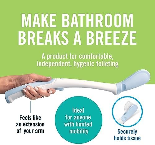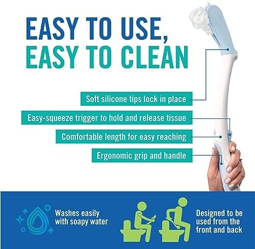 Les mâchoires caoutchoutées douces de l’aide à l’essuyage du papier toilette maintiennent le papier toilette en place pour l’auto-essuyage. La gâchette facile à presser verrouille le tissu en place, puis libère les mouchoirs sans avoir à toucher les mouchoirs usagés