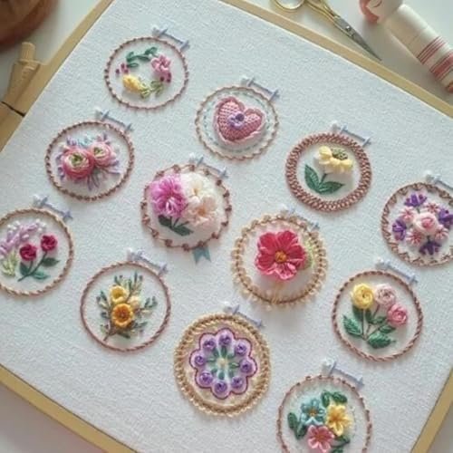 Kit de broderie de fleurs 3D, kits de point de croix pour débutants, kit de broderie de fleurs florales à la main pour adultes et kit de démarrage de broderie florale 12 fleurs différentes avec motif et instructions (français non garanti).