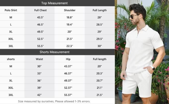 Cet ensemble polo et short pour homme est fabriqué en tissu épais et résistant, composé de 95 % polyester et 5 % élasthanne. La chemise dispose d’une fermeture éclair et d’un col polo, tandis que le short a un cordon de serrage à la taille. Il est adapté pour les activités de plein air telles que le golf, le tennis et d’autres sports, ainsi que pour les loisirs.