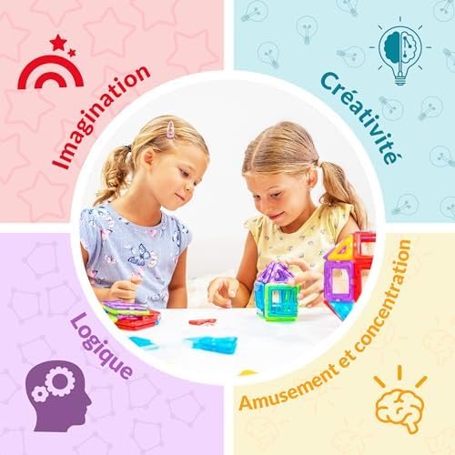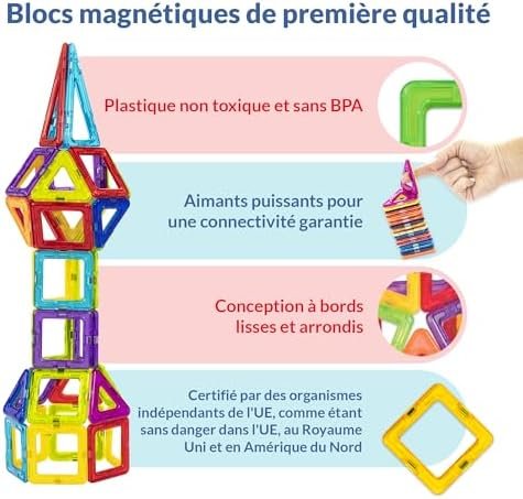 Conçu pour durer – Notre ensemble de blocs de construction magnétiques est suffisamment costaud pour rester parfaitement érigé. Avec ses blocs aimantés de haute qualité et son emballage recyclable, c’est une idée cadeau idéale pour un anniversaire ou pour toute occasion spéciale. Par ailleurs, c’est un jouet idéal à emmener en voyage ou en vacances. À partir de 3 ans.