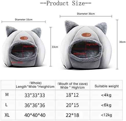 Français : Caractéristique : détachable, confortable et respirant. Fonction : ils se sentent en sécurité et à l’abri, améliorant leur confort général. Matériau : tissu. Saison : hiver. Coussin : coton PP. Type : lit pour chat. Contenu : 1 lit pour animal de compagnie avec coussin intérieur. Taille : M : 33 x 33 x 35 cm (environ 4 kg pour les animaux de compagnie), L : 36 x 36 x 40 cm (environ 6 kg pour les animaux de compagnie). XL : 40 x 40 x 40 cm (environ 12 kg pour les animaux de compagnie). Remarque : en raison de la mesure manuelle, il y a une légère erreur, veuillez nous pardonner ! La forme des animaux étant différente, assurez-vous de choisir la bonne taille.