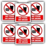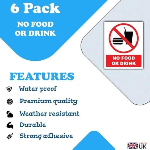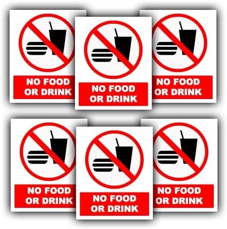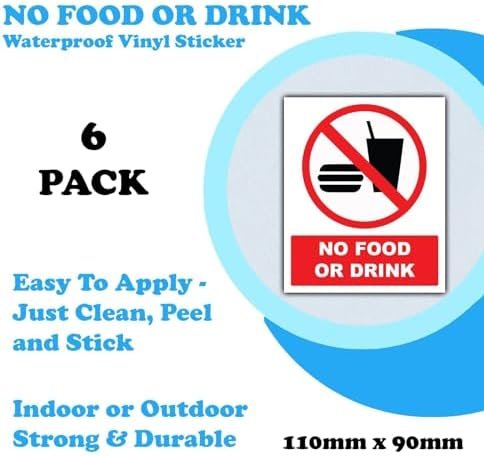 Promouvoir une atmosphère sans nourriture et boisson avec notre lot de 6 autocollants en vinyle imperméables « No Food or Drink » – 110 mm x 90 mm – Facile à voir pour une utilisation en extérieur et en intérieur, conçu pour une visibilité maximale. Fabriqués à partir de vinyle résistant de qualité supérieure, ils sont conçus pour résister à diverses conditions météorologiques, ce qui les rend spécifiques pour les applications intérieures et extérieures. Ces autocollants ne sont pas seulement imperméables, mais aussi résistants au soleil, tout en préservant leurs couleurs vives et leur durabilité, même sous la lumière directe du soleil. Grâce à leur dos adhésif, ces panneaux « No Food or Drink » peuvent être rapidement installés sur n’importe quelle surface lisse, délivrant un message clair et visible.
