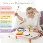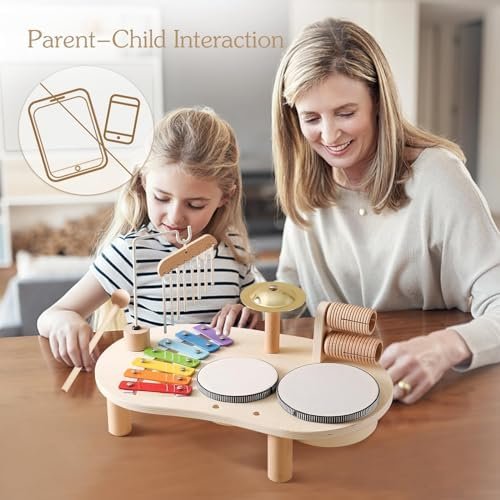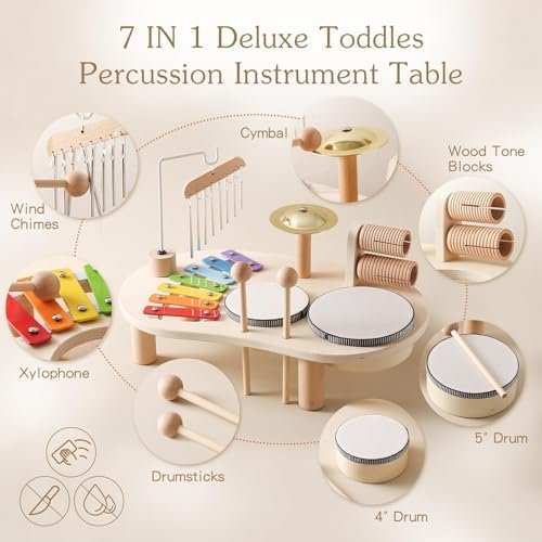 🎵7 FR 1 Table d’instruments de musique de luxe pour enfants🎵 Cet ensemble de tambours d’instruments de musique en bois pour enfants combine différents instruments de percussion, y comprend un xylophone avec table, 1x carillon, 1x tambour de 5 pouces, 1x tambour de 4 pouces, 2xWood Tone Blocks, 1 x cymba, 2x baguettes de batterie, offrant une expérience musicale complète et encourageant la créativité chez votre enfant.Pieds de table préinstallés et montage facile.