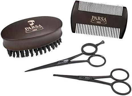 Contenu de la livraison : kit d’entretien de barbe 4 pièces, 1 peigne à barbe, 1 brosse à barbe, 1 paire de ciseaux à barbe, 1 paire de ciseaux pour poils du nez