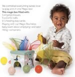 Une boite avec couvercle et fente pour que l’enfant puisse tirer les lingettes de tissu, insérer les cartes et jouer avec les balles ! 5 lingettes en organza, 5 cartes double-face avec fruits et chiffres, 5 balles dont 3 texturées. La boîte est en carton épais et le couvercle en plastique. A partir de 12 mois.